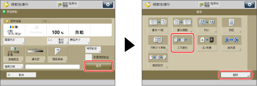 若將原稿放入送稿機,則每批原稿掃描結束後,請從原稿輸出區域取出原稿。 使用「工作建立」模式時,只能變更[變更設定]中顯示的設定。需要事先指定所需的掃描設定。 |