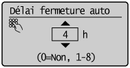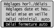 ] pour mettre <Délai fermeture auto> en surbrillance, puis appuyez sur [OK].