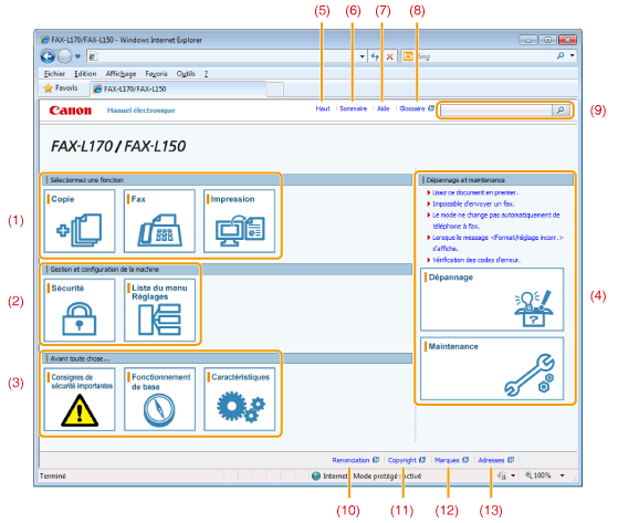 Vous trouverez ici un lien vers le contenu sélectionné, qui fournit des instructions de sécurité, les fonctions de la machine, et la façon de configurer et d'utiliser efficacement cette machine (par exemple, chargement du papier et utilisation du mode Veille). |