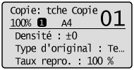 Réglages copieLes réglages indiqués ici s'appliquent uniquement pendant l'opération active. Pour définir des réglages applicables à toutes les opérations de copie, voir "Modification des réglages par défaut".