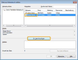 Wenn Sie [Geben Sie die Faxnummer erneut ein, bevor Sie ein Ziel zur "Zielliste" hinzufügen] im Dialogfeld [Sicherheitseinstellungen] der Registerkarte [Spezial] ausgewählt haben, wird das Dialogfeld [Zielliste estätigen] angezeigt, wenn Sie auf [Zu Zielliste hinzufügen] klicken. Nähere Informationen finden Sie in der Online-Hilfe. (Siehe "Anzeigen der Online-Hilfe (PC-Fax)".)