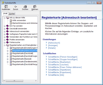 Die Informationen über den aktuellen Faxtreiberbildschirm werden rechts im Fenster angezeigt.