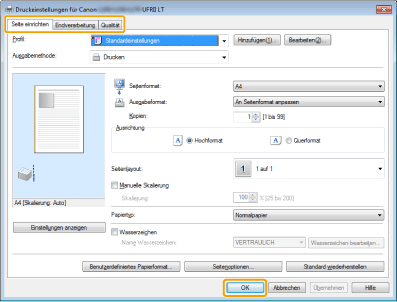 Klicken Sie auf die Registerkarten [Seite einrichten], [Endverarbeitung] und [Qualität], und geben Sie dann die gewünschten Elemente an.
