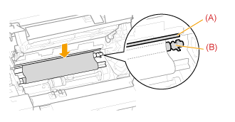Ziehen Sie das gestaute Papier vorsichtig zwischen der Fixiereinheit (A) und der Walze (B) nach unten, bis die Führungskante aus dem Gerät herauskommt.