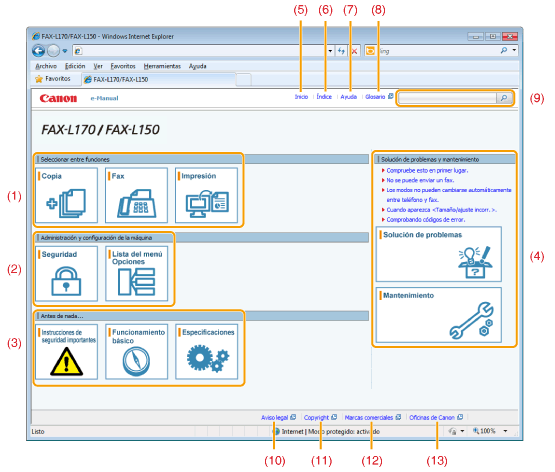 Proporciona un enlace al contenido seleccionado, para describir las instrucciones de seguridad, las características de la máquina y cómo configurar y utilizar la máquina eficazmente (por ejemplo, carga de papel y uso del modo de reposo). |