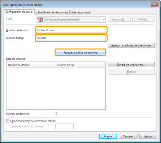 Si ha seleccionado [Reintroducir el número de fax antes de agregar el destino a [Lista de destiinos]] en el cuadro de diálogo [Configuración de seguridad] de la ventana [Especial], se mostrará el cuadro de diálogo [Confirmar destino] al hacer clic en [Agregar a la lista de destinos]. Para obtener más información, consulte la ayuda en línea (consulte "Visualización de la ayuda en línea (PC Fax)").