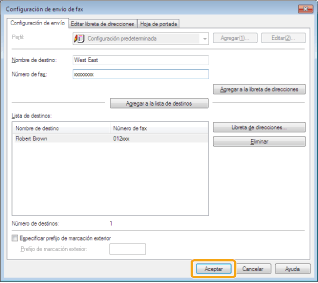 El número de destinos a los que puede enviar faxes al mismo tiempo dependerá de cómo se incluya la portada. Para obtener una información detallada, consulte la ayuda en línea (consulte "Visualización de la ayuda en línea (PC Fax)").