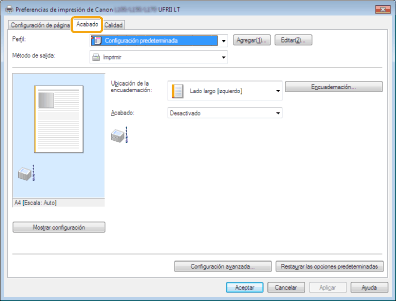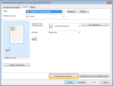 Para obtener las instrucciones acerca de cómo acceder a la pantalla del controlador de impresora, consulte "Impresión" y "Configuración de las opciones de impresión predeterminadas".