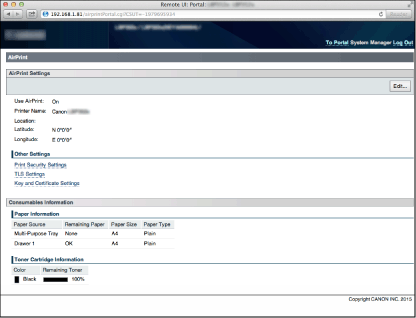 You can display the screen for AirPrint, on which you can not only access the AirPrint Settings but also view information about consumables, such as paper and toner cartridge. Further, you can configure security function settings (