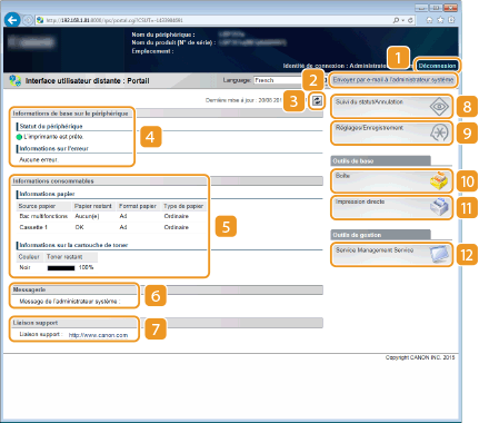 Affiche l'état actuel de l'appareil et les informations d'erreur. En cas d'erreur, le lien vers la page Informations d'erreur apparaît.