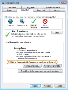 Quite la marca de la casilla de verificación [Habilitar modo protegido (requiere reiniciar Internet Explorer)] si está seleccionada.