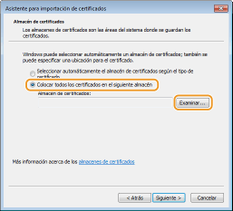 Seleccione [Colocar todos los certificados en el siguiente almacén] y haga clic en [Examinar].