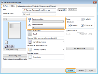 Seleccione el tamaño del papel en [Tamaño de salida]