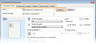 Haga clic en la pestaña [Configuración básica], [Configuración de página], [Acabado], [Origen del papel] o [Calidad] para especificar las opciones de impresión en cada pantalla según sea necesario.
