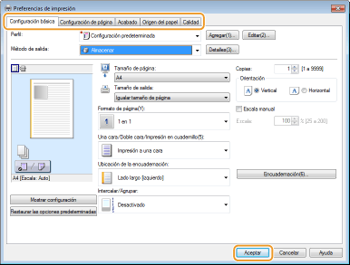 Haga clic en las pestañas [Configuración básica], [Configuración de página], [Acabado], [Origen del papel] o [Calidad] para especificar las opciones de impresión en cada pantalla según sea necesario.