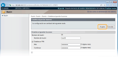 Para configurar un PIN, seleccione la casilla de verificación [Establecer PIN] e introduzca un número de hasta siete dígitos para el PIN en el cuadro de texto [PIN]. A modo de confirmación, introduzca el mismo número en el cuadro de texto [Confirmar].