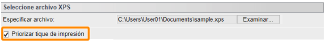 Al especificar las opciones de impresión para archivos XPSDesmarque la casilla de verificación [Priorizar tique de impresión]. Si la casilla de verificación está seleccionada, algunos elementos no estarán disponibles.