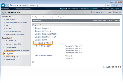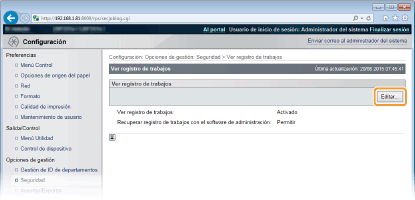 Si selecciona la casilla de verificación, se puede utilizar un software de gestión de dispositivos, como imageWARE Enterprise Management Console, para obtener el historial de trabajos de impresión. Quite la marca de la casilla de verificación para deshabilitar el software de gestión para obtener el historial de trabajos de impresión. Esta función se habilita automáticamente cuando se selecciona la casilla de verificación [Ver registro de trabajos].