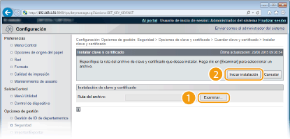 Haga clic en [Opciones de clave y certificado] para instalar un par de claves o en [Opciones de certificado de CA] para instalar un certificado de CA.