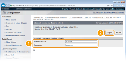 [Contraseña] Introduzca hasta 24 caracteres alfanuméricos en la contraseña de la clave privada establecida en el archivo que desee registrar.