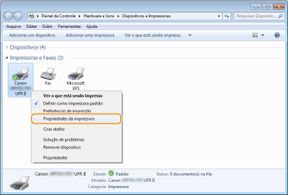 Clique com o botão direito no ícone da sua impressora e clique em [Propriedades da impressora] ou [Propriedades].