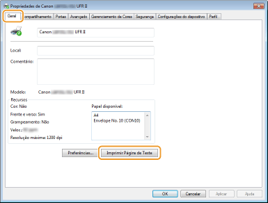 Clique em [Imprimir Página de Teste] na guia [Geral].