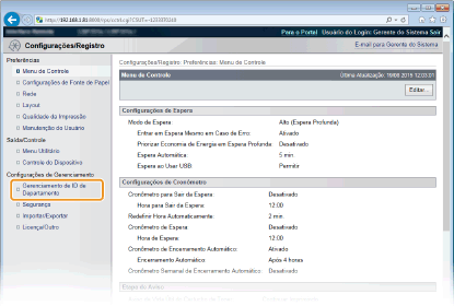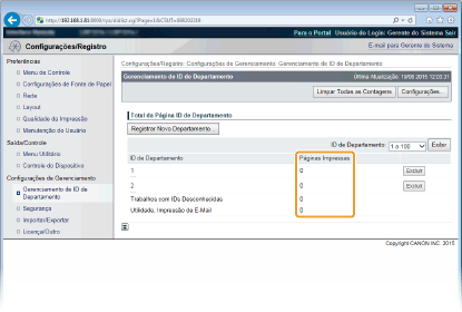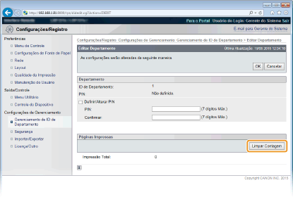 Para zerar a contagem de páginas de cada departamento, clique no link de texto em [ID de Departamento] e clique em [Limpar Contagem]  [OK].