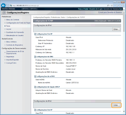 Seleção de configurações no painel de operaçãoVocê também pode ativar ou desativar os endereços IPv6 no menu de configuração do painel de operação. Configurações IPv6