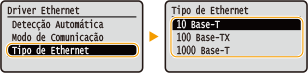 Selecione o tipo de Ethernet ![]() ![]() ![]() Ao selecionar <1000 Base-T>, a configuração de <Modo de Comunicação> é alterada para <Duplex Total>.