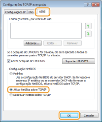 Clique na guia [WINS], selecione [Ativar NetBIOS sobre TCP/IP] e clique em [OK].