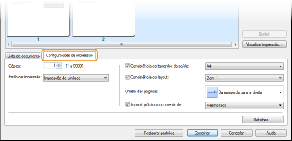 Clique na guia [Print Settings] (Configurações de impressão) para exibir a tela de especificação das configurações de impressão, como o número de cópias, ou impressão dos dois lados/de um lado. As configurações especificadas aqui são aplicadas a todo o trabalho de impressão.