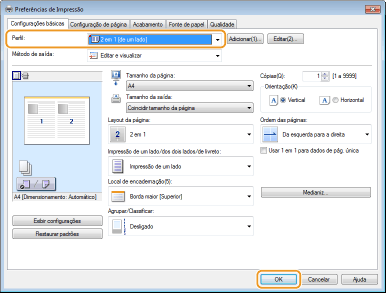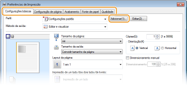Clique nas guias [Configurações básicas], [Configuração de página], [Acabamento], [Fonte de papel] ou [Qualidade] para especificar em cada tela conforme necessário.