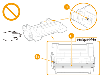 ) ou nos contatos elétricos ( ). Para evitar arranhar a superfície do cilindro dentro da máquina ou expô-la a luz, não abra a tampa protetora do cilindro ( ).![]() Não remova o cartucho de toner desta máquina ou do saco protetor desnecessariamente.