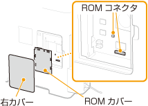コントロールROMを本機に取り付ける方法について説明します。ROMは右カバー内のROMコネクタに取り付けます。作業を始める前に、設置についての注意事項をお読みください。