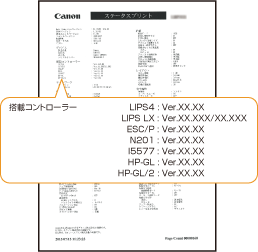 共通ステータスプリントを印刷し、「搭載コントローラー」にコントロールROMのエミュレーション(「N201」など)が表示されていることを確認します。コントロールROMのエミュレーションが表示されていれば、ROMは正しく取り付けられています。