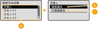 項目にアスタリスク(*)が付いているときオプションのペーパーフィーダーやペーパーデッキ、封筒フィーダーまたはSDカードの有無や他の設定内容によっては表示されません。
