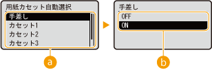 <用紙不一致時手差し>を<ON>に設定しているときは、<手差し優先>を<ON>に設定しても給紙カセットが優先されます。