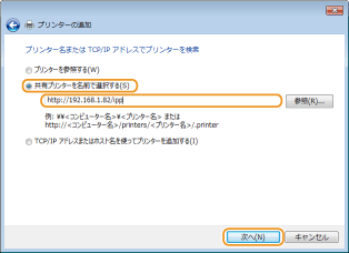 IPPを使用するときは、接続先に「http://<本機のIPアドレス>/ipp」を入力します。