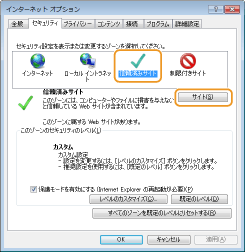 [セキュリティ]タブで[信頼済みサイト]を選び、[サイト]をクリックする