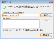 「https://<本機のIPアドレスまたはホスト名.ドメイン名>/」が表示されていることを確認し、[追加]