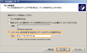 [インターネット上または自宅/会社のネットワーク上のプリンタに接続する]を選び、接続先を入力して、[次へ]をクリックする