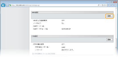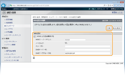 [SMB設定]の[ワークグループ名]が設定されているときは自動的に同じ名前が設定されています。逆に、ここでワークグループ名を変更すると[SMB設定]の[ワークグループ名]にも反映されます。