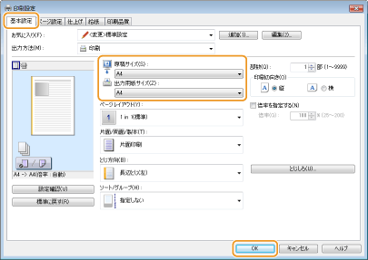 [基本設定]タブ [原稿サイズ]で文書のサイズを選択 [出力用紙サイズ]で印刷用紙サイズを選択 [OK]