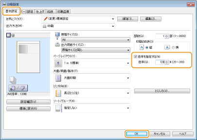 [基本設定]タブ [倍率を指定する]にチェックマークを付ける [倍率]に数字を入力 [OK]