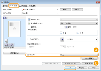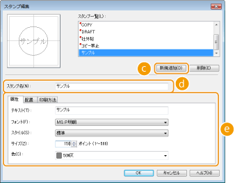 それぞれのタブをクリックして、スタンプとして表示する文字、色や配置などを設定します。各設定項目の詳細については、プリンタードライバー画面の[ヘルプ]をクリックして、ヘルプを参照してください。