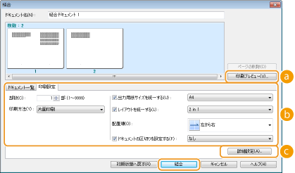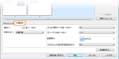 [印刷設定]タブをクリックすると、印刷部数や片面/両面印刷などの設定画面が表示されます。ここでの設定は、結合する文書全体に適用されます。