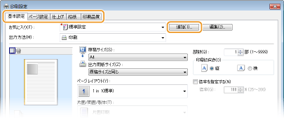 必要に応じて[基本設定]、[ページ設定]、[仕上げ]、[給紙]、[印刷品質]タブから設定を行います。