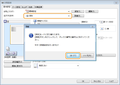 [出力方法]で[保存]を選び、[はい]をクリックする