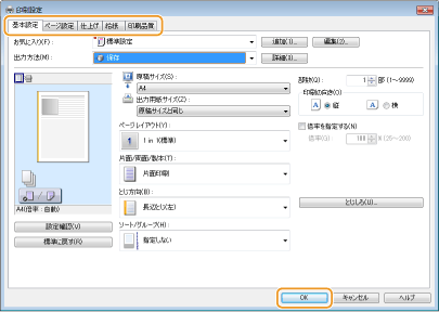必要に応じて[基本設定]、[ページ設定]、[仕上げ]、[給紙]、[印刷品質]タブから設定を行います。いろいろな印刷設定
