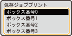 印刷データをSDカードに保存するときの格納場所のことをボックスといいます。ここでは保存先のボックスの番号を選択します。ボックスを区別しやすくするために、ボックスに名前を付けることができます。ボックスに名前や暗証番号を設定する